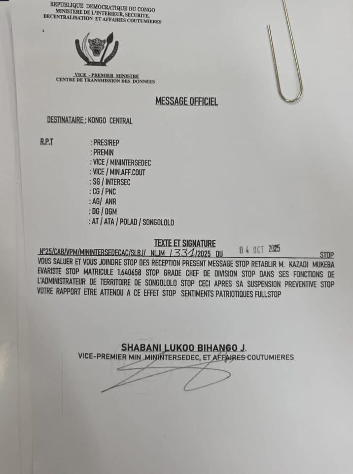 Le vice-premier ministre, ministre de l’Intérieur, de la Sécurité et des Affaires coutumières, Jacquemin Shabani Lukoo, a réhabilité Évariste Kazadi Mukeba dans ses fonctions d’administrateur du territoire de Songololo, selon un message officiel daté du 4 octobre 2025.